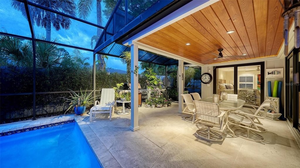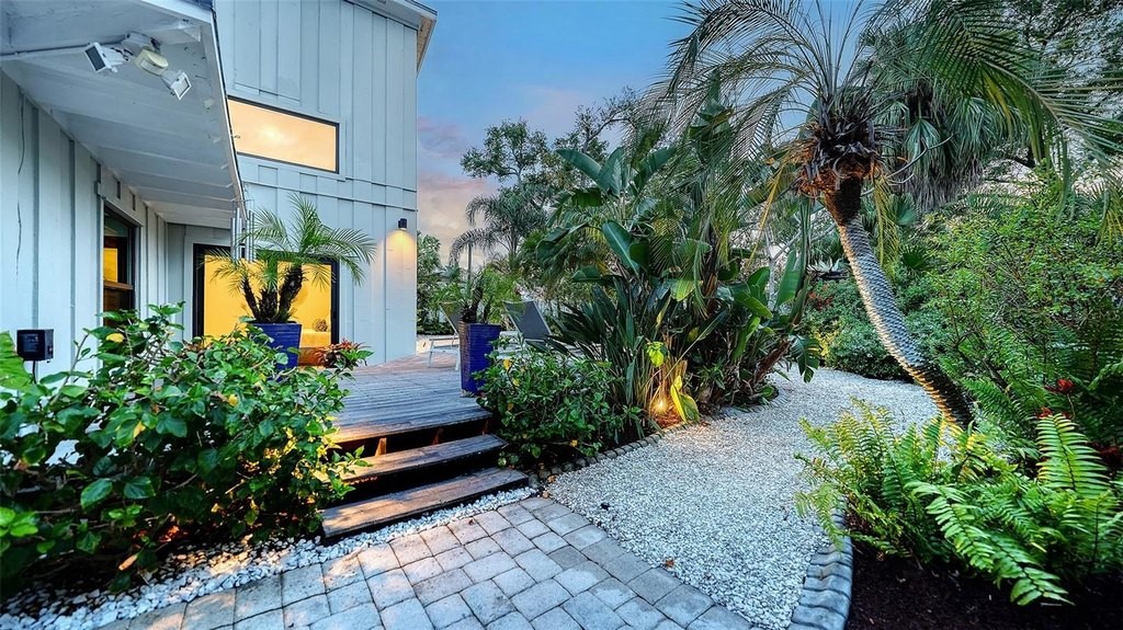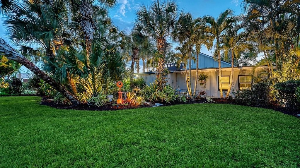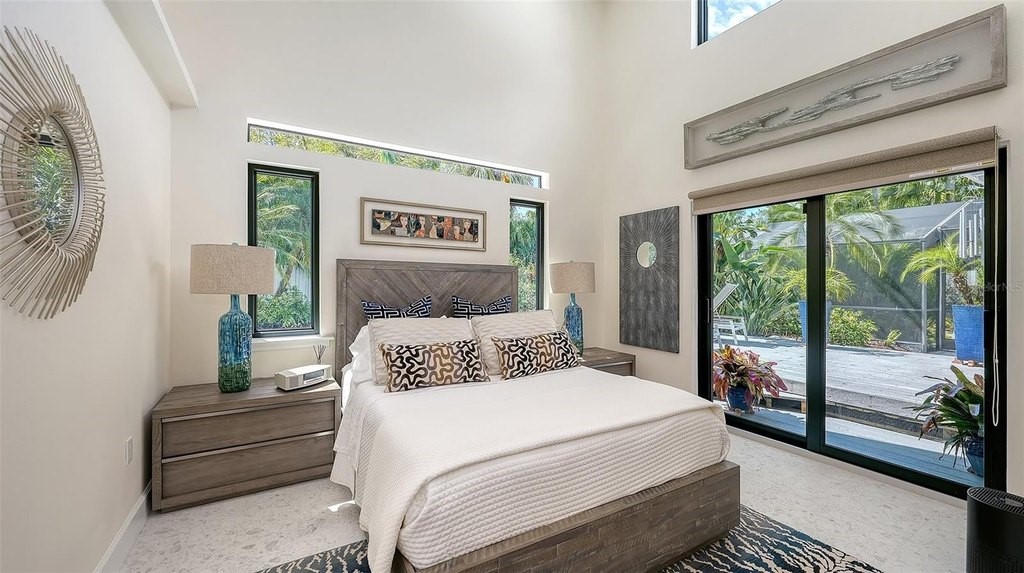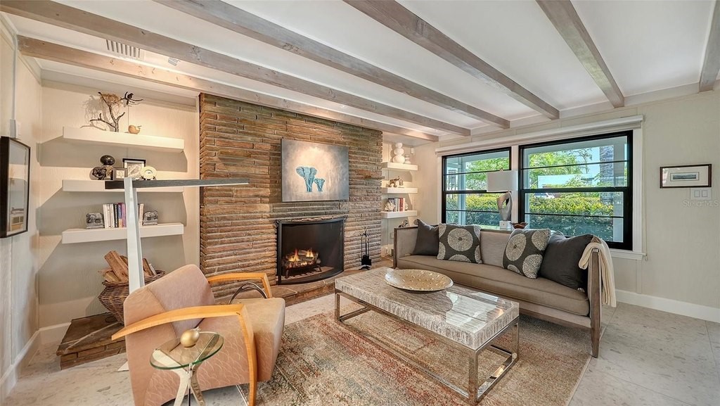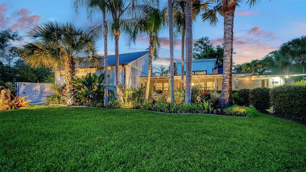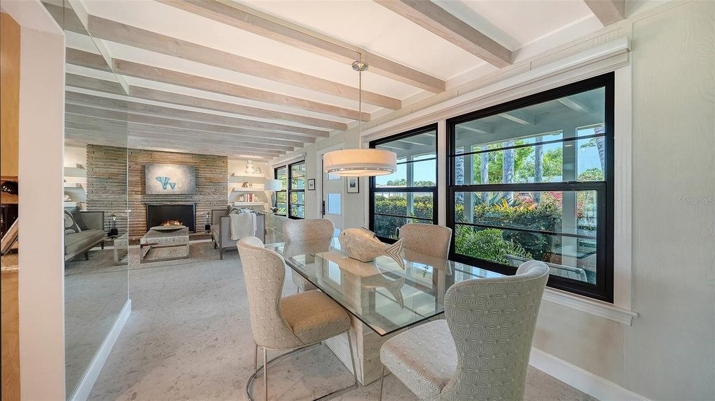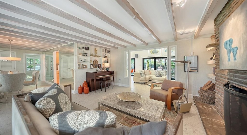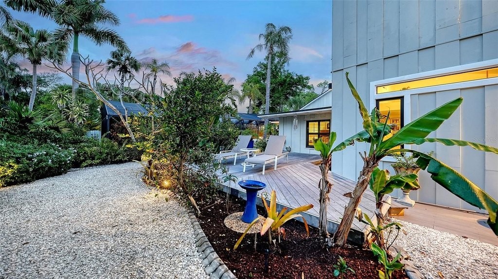 Mid-Century Soul + Coastal Sophistication + West of the Trail. Welcome to a masterfully curated Mid-Century Modern retreat located just north of the Stickney Point Bridge in one of Sarasota's coveted zip codes. Situated on a lush 0.31-acre corner lot, this property offers a rare sense of tranquility and total privacy with no HOA or deed restrictions-all just minutes from the world-renowned quartz sands of Siesta Key or Sarasota's vibrant Downtown. The Aesthetic: Architectural Artistry. This isn't just a home; it's a design statement. Every inch celebrates the iconic MCM silhouette, from the striking floor-to-ceiling stone fireplace to the authentic exposed beams and dramatic vaulted ceilings. The timeless architecture is elevated by contemporary finishes, including large-format porcelain tile, Hunter Douglas window treatments, and custom stained-glass transoms that bathe the space in natural light. The Vibe: Indoor-Outdoor Synergy. Live the Sarasota dream in a space designed for the ultimate entertainer. The family room features pocketing glass sliders that reveal your private outdoor oasis, seamlessly dissolving the line between indoors and out. Host "golden hour" gatherings on the 20' x 14' composite deck, dine alfresco beneath the Cypress-wood lanai, or unwind in the heated saltwater pool-all enveloped by lush, professionally designed tropical landscaping and a fully fenced yard. Inside the lanai, a tranquil pond with a pump and cascading waterfall creates the perfect setting for meditation. The private, gated west-side yard-just off the primary bedroom deck-offers an additional secluded retreat, while thoughtfully designed landscape lighting sets the stage for stunning evening vistas. Retreat & Versatility: The Primary suite is a true sanctuary, boasting a sun-drenched reading nook, a spacious walk-in closet, and private deck access perfect for your morning coffee. On the opposite wing, a secondary primary-style suite offers ultimate flexibility for high-end guest hosting or a sophisticated home office. Another spacious guest bedroom completes the floorplan. With three full baths and a thoughtful "split" floor plan, the layout is as functional as it is beautiful. Modern "Peace of Mind Checklist" features include: new roof (2024), new ductwork (2024), fresh exterior paint (2024), 3 new water heaters (2024/2023), impact rated windows & doors (2023/2020), high-efficiency A/C (2020), Honeywell Home WiFi thermostat, and updated ADT monitored security system. Parking Pro: Two separate driveways plus a one-car garage for all your toys.