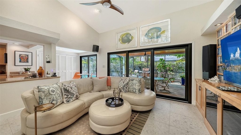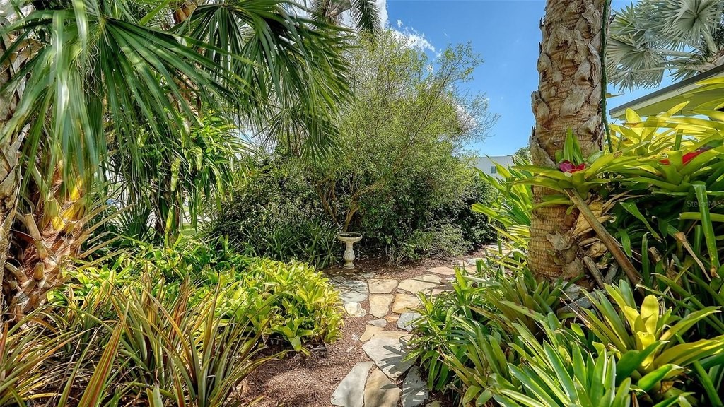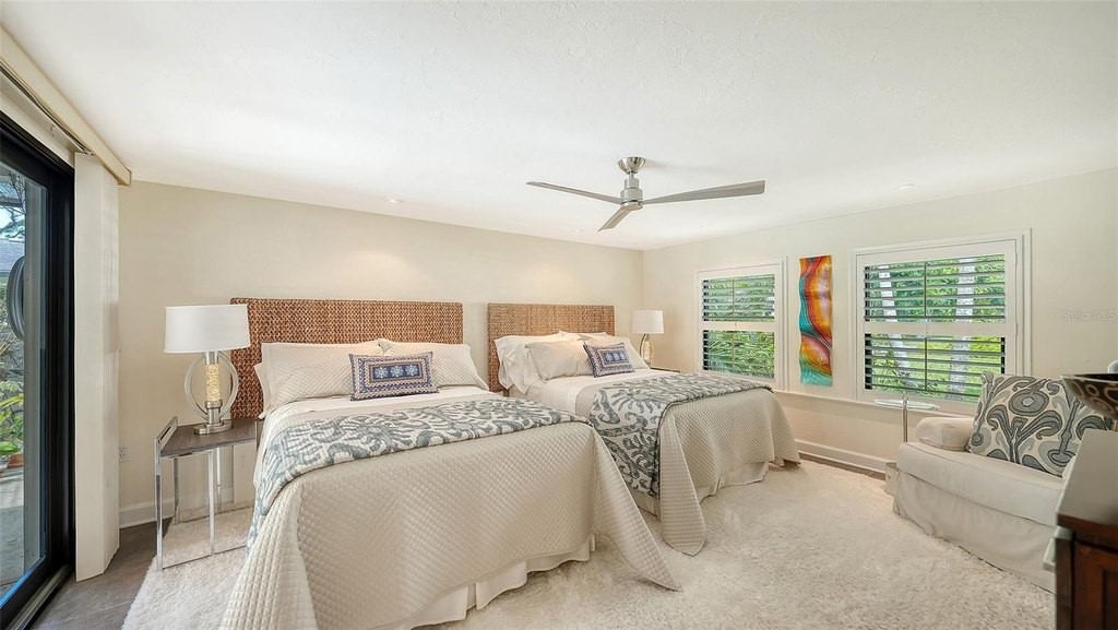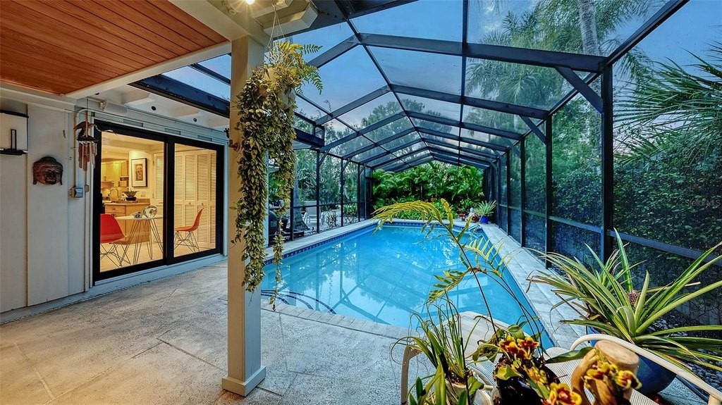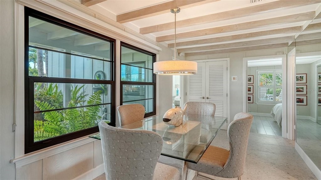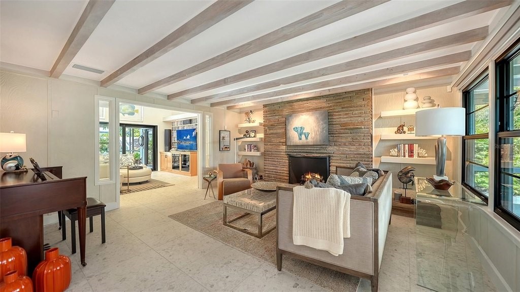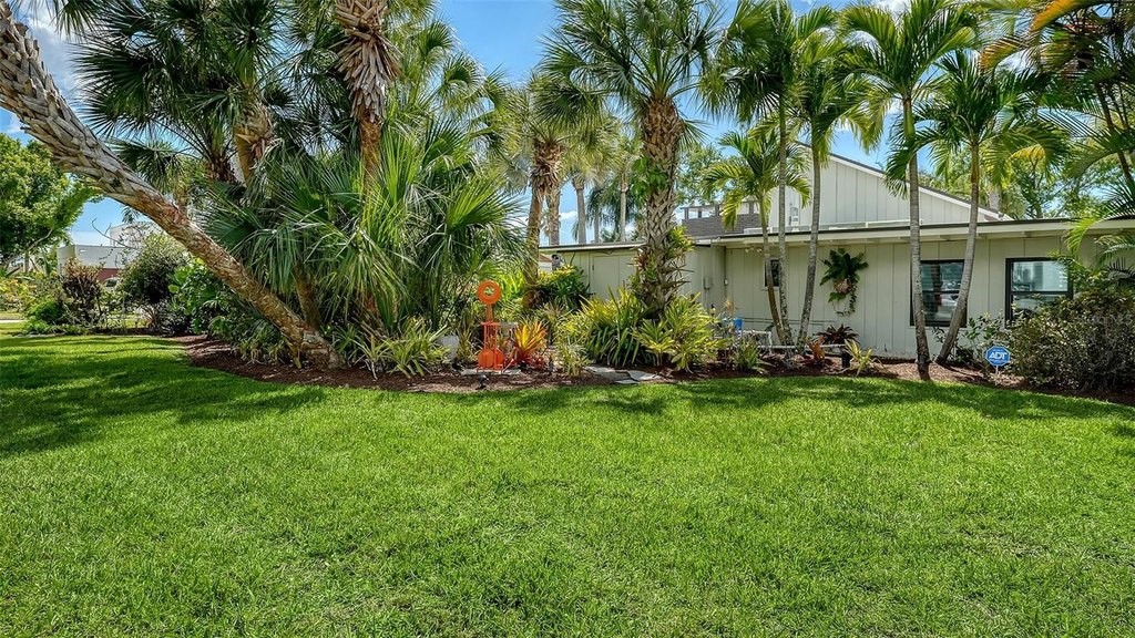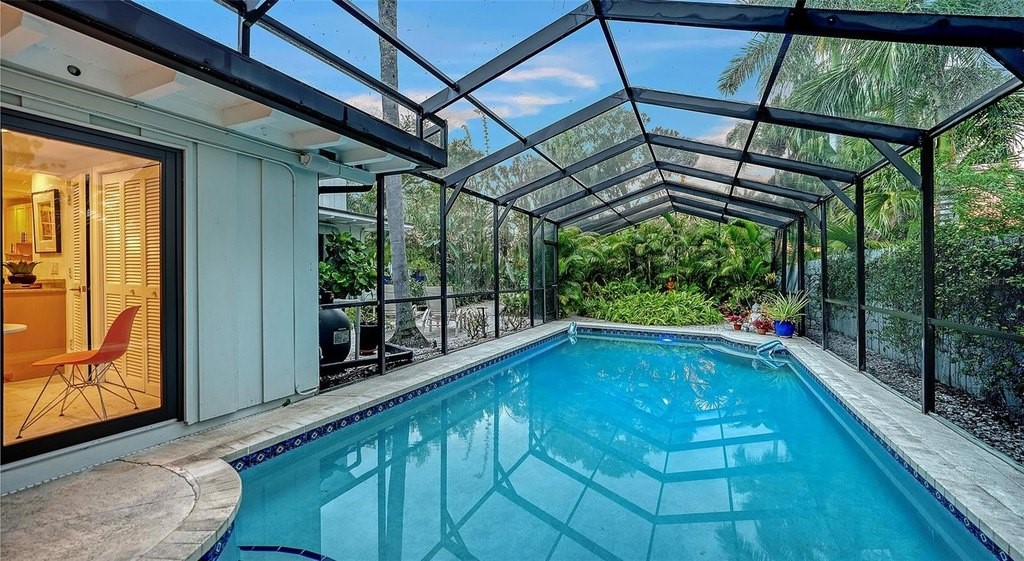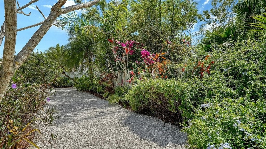 Mid-Century Soul + Coastal Sophistication + West of the Trail. Welcome to a masterfully curated Mid-Century Modern retreat located just north of the Stickney Point Bridge in one of Sarasota's coveted zip codes. Situated on a lush 0.31-acre corner lot, this property offers a rare sense of tranquility and total privacy with no HOA or deed restrictions-all just minutes from the world-renowned quartz sands of Siesta Key or Sarasota's vibrant Downtown. The Aesthetic: Architectural Artistry. This isn't just a home; it's a design statement. Every inch celebrates the iconic MCM silhouette, from the striking floor-to-ceiling stone fireplace to the authentic exposed beams and dramatic vaulted ceilings. The timeless architecture is elevated by contemporary finishes, including large-format porcelain tile, Hunter Douglas window treatments, and custom stained-glass transoms that bathe the space in natural light. The Vibe: Indoor-Outdoor Synergy. Live the Sarasota dream in a space designed for the ultimate entertainer. The family room features pocketing glass sliders that reveal your private outdoor oasis, seamlessly dissolving the line between indoors and out. Host "golden hour" gatherings on the 20' x 14' composite deck, dine alfresco beneath the Cypress-wood lanai, or unwind in the heated saltwater pool-all enveloped by lush, professionally designed tropical landscaping and a fully fenced yard. Inside the lanai, a tranquil pond with a pump and cascading waterfall creates the perfect setting for meditation. The private, gated west-side yard-just off the primary bedroom deck-offers an additional secluded retreat, while thoughtfully designed landscape lighting sets the stage for stunning evening vistas. Retreat & Versatility: The Primary suite is a true sanctuary, boasting a sun-drenched reading nook, a spacious walk-in closet, and private deck access perfect for your morning coffee. On the opposite wing, a secondary primary-style suite offers ultimate flexibility for high-end guest hosting or a sophisticated home office. Another spacious guest bedroom completes the floorplan. With three full baths and a thoughtful "split" floor plan, the layout is as functional as it is beautiful. Modern "Peace of Mind Checklist" features include: new roof (2024), new ductwork (2024), fresh exterior paint (2024), 3 new water heaters (2024/2023), impact rated windows & doors (2023/2020), high-efficiency A/C (2020), Honeywell Home WiFi thermostat, and updated ADT monitored security system. Parking Pro: Two separate driveways plus a one-car garage for all your toys.