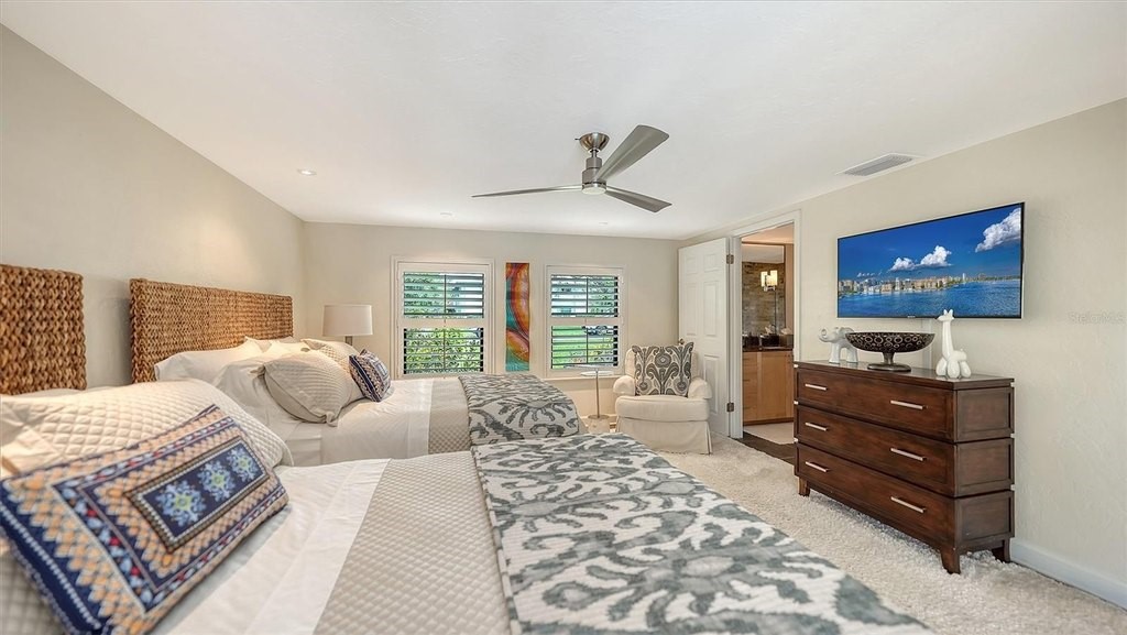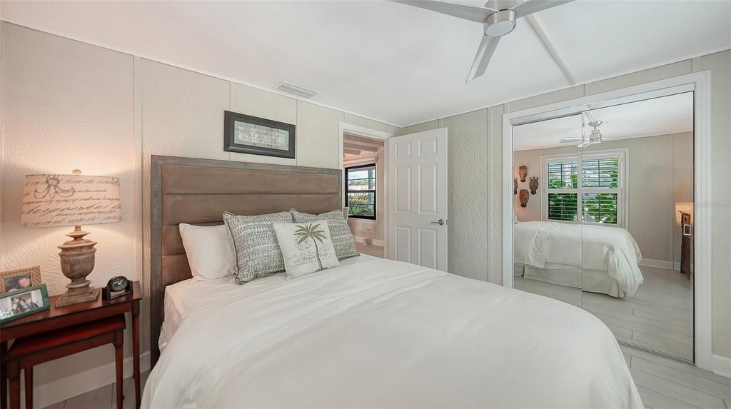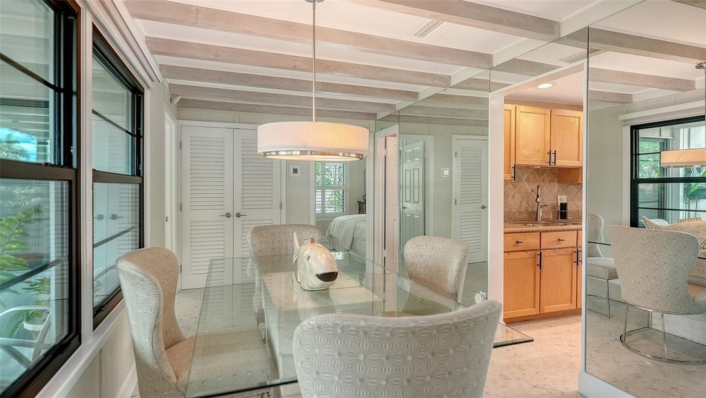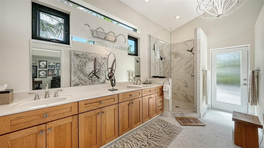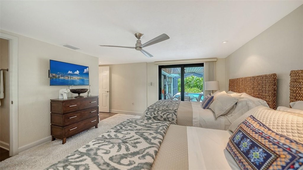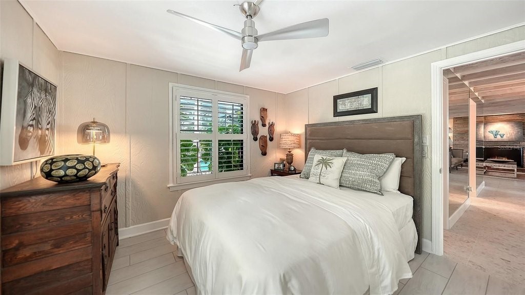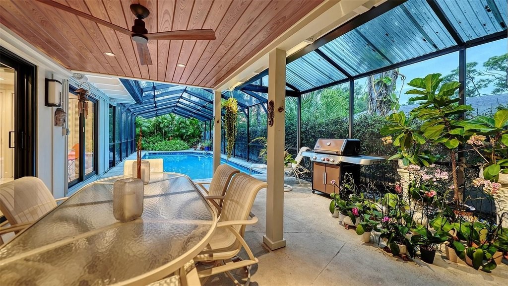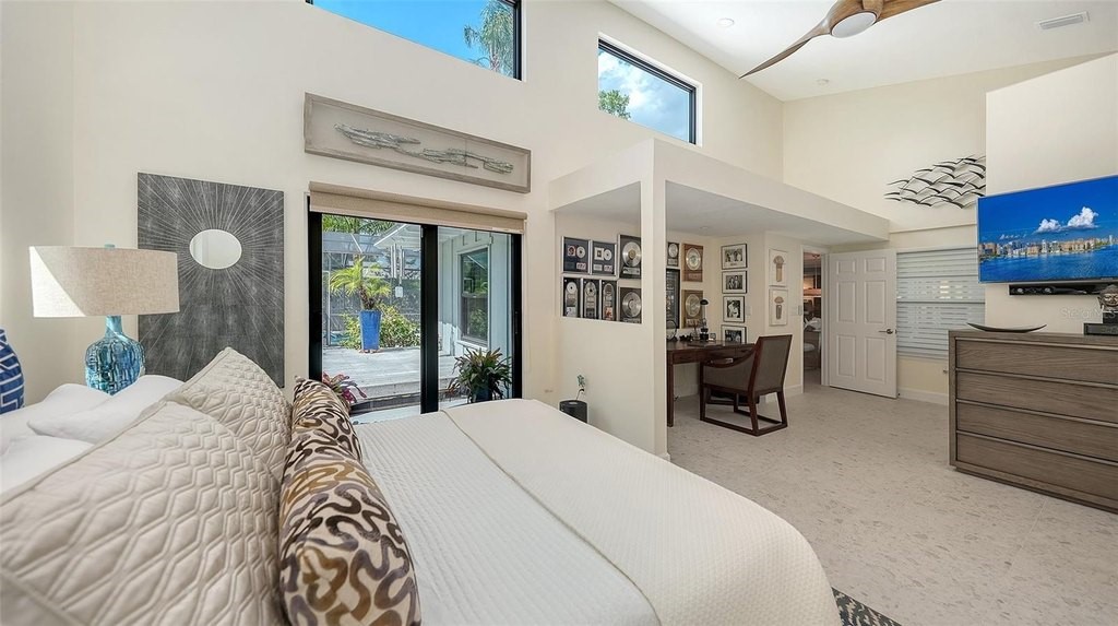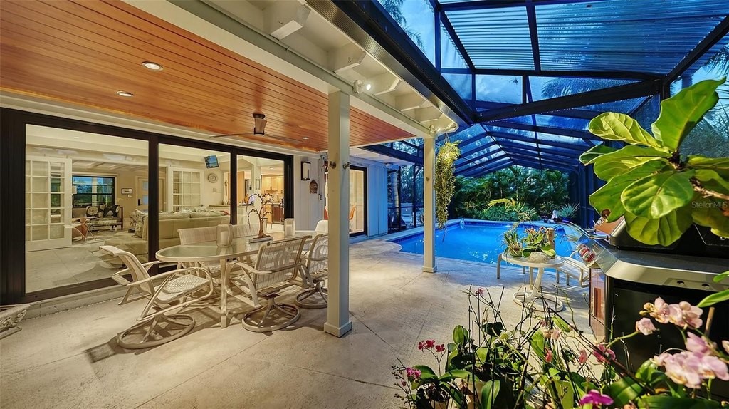 Mid-Century Soul + Coastal Sophistication + West of the Trail. Welcome to a masterfully curated Mid-Century Modern retreat located just north of the Stickney Point Bridge in one of Sarasota's coveted zip codes. Situated on a lush 0.31-acre corner lot, this property offers a rare sense of tranquility and total privacy with no HOA or deed restrictions-all just minutes from the world-renowned quartz sands of Siesta Key or Sarasota's vibrant Downtown. The Aesthetic: Architectural Artistry. This isn't just a home; it's a design statement. Every inch celebrates the iconic MCM silhouette, from the striking floor-to-ceiling stone fireplace to the authentic exposed beams and dramatic vaulted ceilings. The timeless architecture is elevated by contemporary finishes, including large-format porcelain tile, Hunter Douglas window treatments, and custom stained-glass transoms that bathe the space in natural light. The Vibe: Indoor-Outdoor Synergy. Live the Sarasota dream in a space designed for the ultimate entertainer. The family room features pocketing glass sliders that reveal your private outdoor oasis, seamlessly dissolving the line between indoors and out. Host "golden hour" gatherings on the 20' x 14' composite deck, dine alfresco beneath the Cypress-wood lanai, or unwind in the heated saltwater pool-all enveloped by lush, professionally designed tropical landscaping and a fully fenced yard. Inside the lanai, a tranquil pond with a pump and cascading waterfall creates the perfect setting for meditation. The private, gated west-side yard-just off the primary bedroom deck-offers an additional secluded retreat, while thoughtfully designed landscape lighting sets the stage for stunning evening vistas. Retreat & Versatility: The Primary suite is a true sanctuary, boasting a sun-drenched reading nook, a spacious walk-in closet, and private deck access perfect for your morning coffee. On the opposite wing, a secondary primary-style suite offers ultimate flexibility for high-end guest hosting or a sophisticated home office. Another spacious guest bedroom completes the floorplan. With three full baths and a thoughtful "split" floor plan, the layout is as functional as it is beautiful. Modern "Peace of Mind Checklist" features include: new roof (2024), new ductwork (2024), fresh exterior paint (2024), 3 new water heaters (2024/2023), impact rated windows & doors (2023/2020), high-efficiency A/C (2020), Honeywell Home WiFi thermostat, and updated ADT monitored security system. Parking Pro: Two separate driveways plus a one-car garage for all your toys.