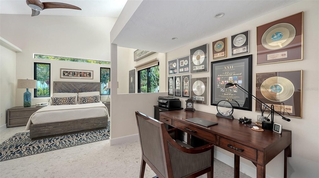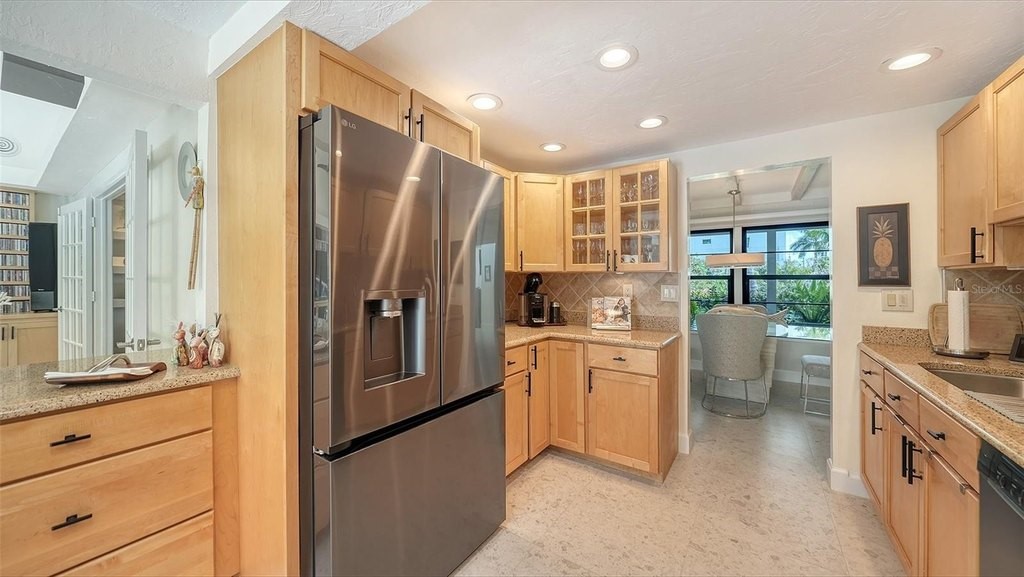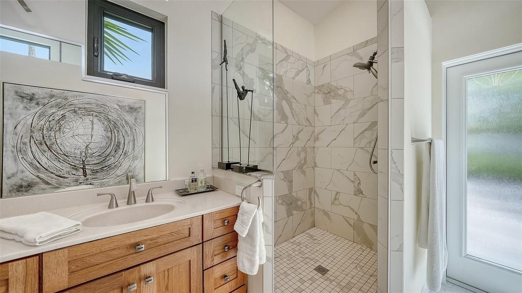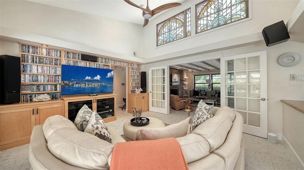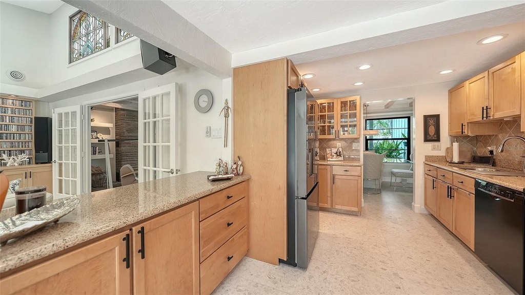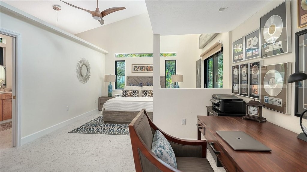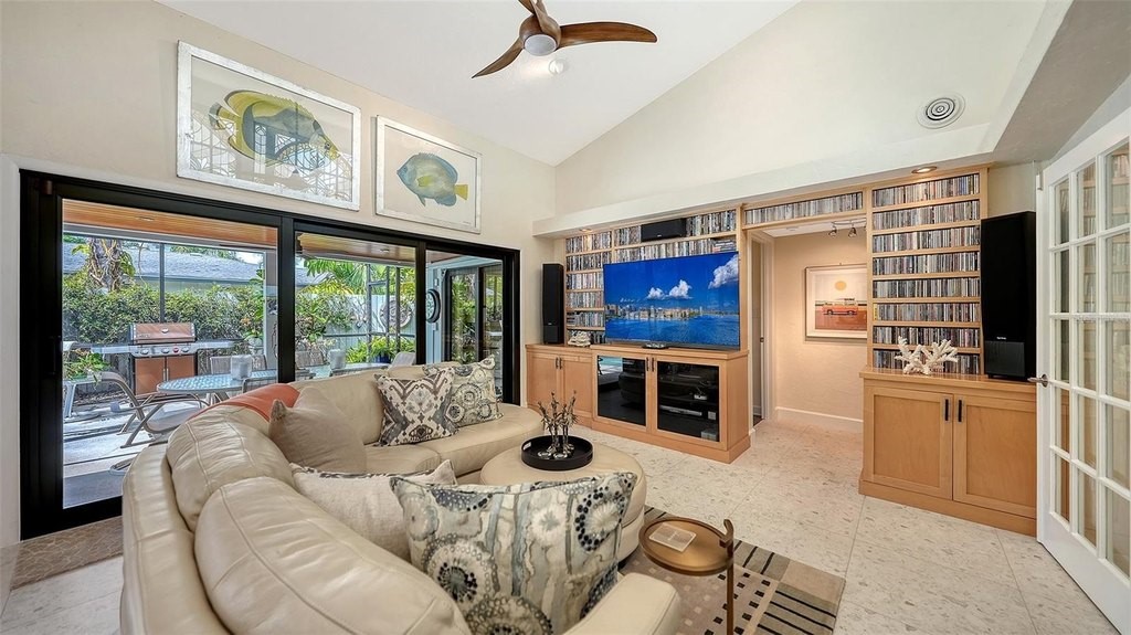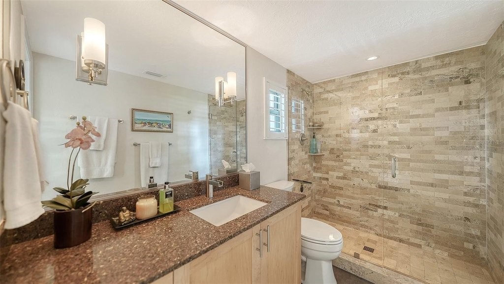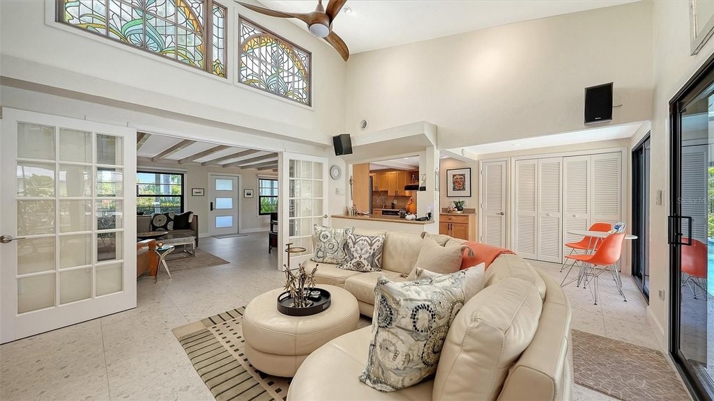 Mid-Century Soul + Coastal Sophistication + West of the Trail. Welcome to a masterfully curated Mid-Century Modern retreat located just north of the Stickney Point Bridge in one of Sarasota's coveted zip codes. Situated on a lush 0.31-acre corner lot, this property offers a rare sense of tranquility and total privacy with no HOA or deed restrictions-all just minutes from the world-renowned quartz sands of Siesta Key or Sarasota's vibrant Downtown. The Aesthetic: Architectural Artistry. This isn't just a home; it's a design statement. Every inch celebrates the iconic MCM silhouette, from the striking floor-to-ceiling stone fireplace to the authentic exposed beams and dramatic vaulted ceilings. The timeless architecture is elevated by contemporary finishes, including large-format porcelain tile, Hunter Douglas window treatments, and custom stained-glass transoms that bathe the space in natural light. The Vibe: Indoor-Outdoor Synergy. Live the Sarasota dream in a space designed for the ultimate entertainer. The family room features pocketing glass sliders that reveal your private outdoor oasis, seamlessly dissolving the line between indoors and out. Host "golden hour" gatherings on the 20' x 14' composite deck, dine alfresco beneath the Cypress-wood lanai, or unwind in the heated saltwater pool-all enveloped by lush, professionally designed tropical landscaping and a fully fenced yard. Inside the lanai, a tranquil pond with a pump and cascading waterfall creates the perfect setting for meditation. The private, gated west-side yard-just off the primary bedroom deck-offers an additional secluded retreat, while thoughtfully designed landscape lighting sets the stage for stunning evening vistas. Retreat & Versatility: The Primary suite is a true sanctuary, boasting a sun-drenched reading nook, a spacious walk-in closet, and private deck access perfect for your morning coffee. On the opposite wing, a secondary primary-style suite offers ultimate flexibility for high-end guest hosting or a sophisticated home office. Another spacious guest bedroom completes the floorplan. With three full baths and a thoughtful "split" floor plan, the layout is as functional as it is beautiful. Modern "Peace of Mind Checklist" features include: new roof (2024), new ductwork (2024), fresh exterior paint (2024), 3 new water heaters (2024/2023), impact rated windows & doors (2023/2020), high-efficiency A/C (2020), Honeywell Home WiFi thermostat, and updated ADT monitored security system. Parking Pro: Two separate driveways plus a one-car garage for all your toys.